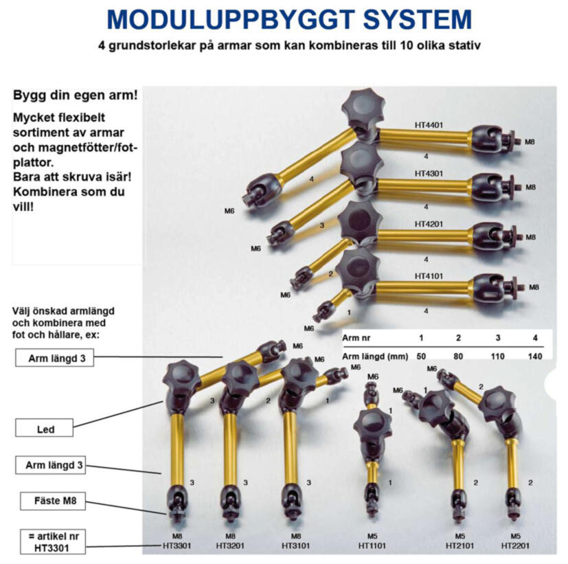 Välj mellan 4 olika grundstorlekar på armar som kan kombineras till 10 olika stativ. Dessutom finns 8 olika magneter - från världens minsta till- och frånkopplingsbara magnet (320N) till den största magnetfoten med hela 1300N.