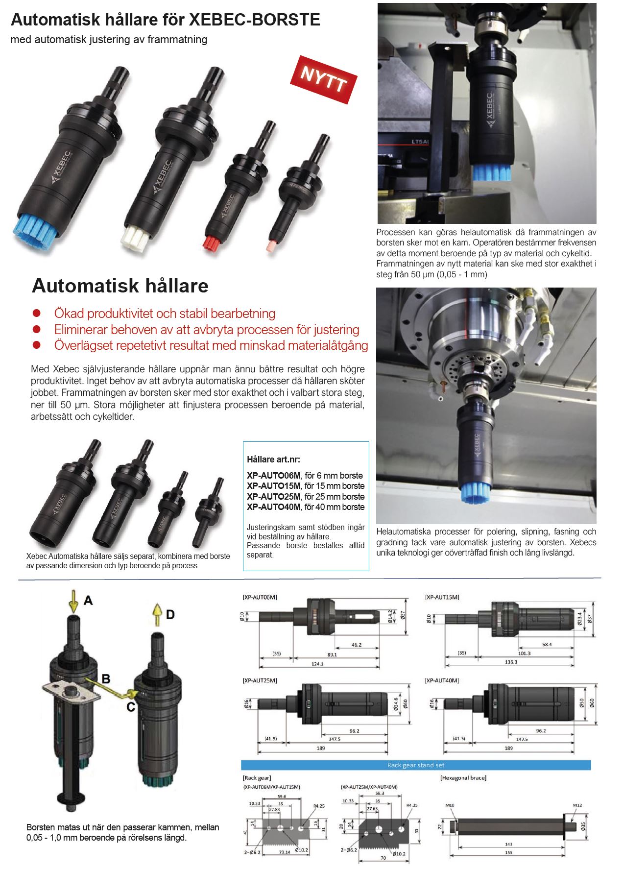 Med Xebec självjusterande hållare uppnår man ännu bättre resultat och högre produktivitet. Inget behov av att avbryta automatiska processer då hållaren sköter jobbet. Frammatningen av borsten sker med stor exakthet och i valbart stora steg, ner till 50 μm. Stora möjligheter att finjustera processen beroende på material, arbetssätt och cykeltider.