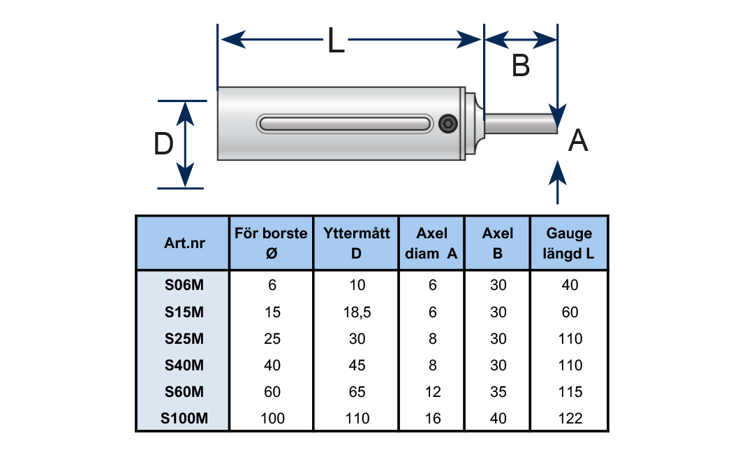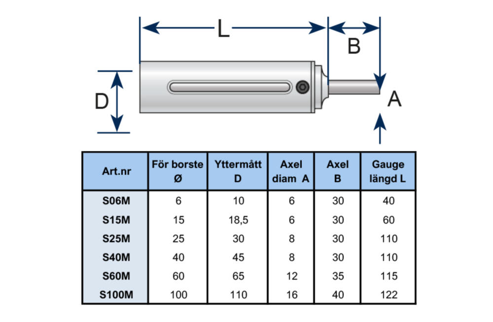 Kompletteras med hållare som finns i olika storlekar beroende på vilken borste som valts. Se typ S06M - S60M