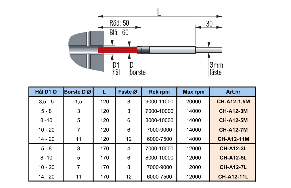 Gradtjockleken får inte överstiga 0,1 mm och borsten finns för 3-20 mm hål.