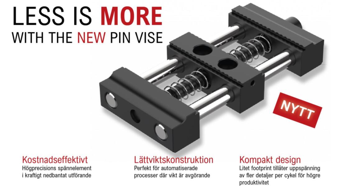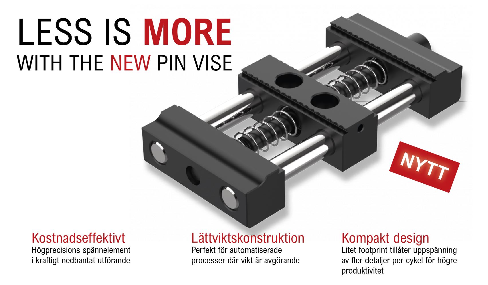 Den kompakta designen gör att du kan montera fler Pin-Vise-skruvstycken på liten yta. Dessutom är det avskalade skruvstyckets design idealisk för automatiserade applikationer med viktbegränsningar. Gör din befintliga utrustning mer effektiv genom att köra flera delar per cykel. Det finns flera versioner och stort utbud adapterplattor.
