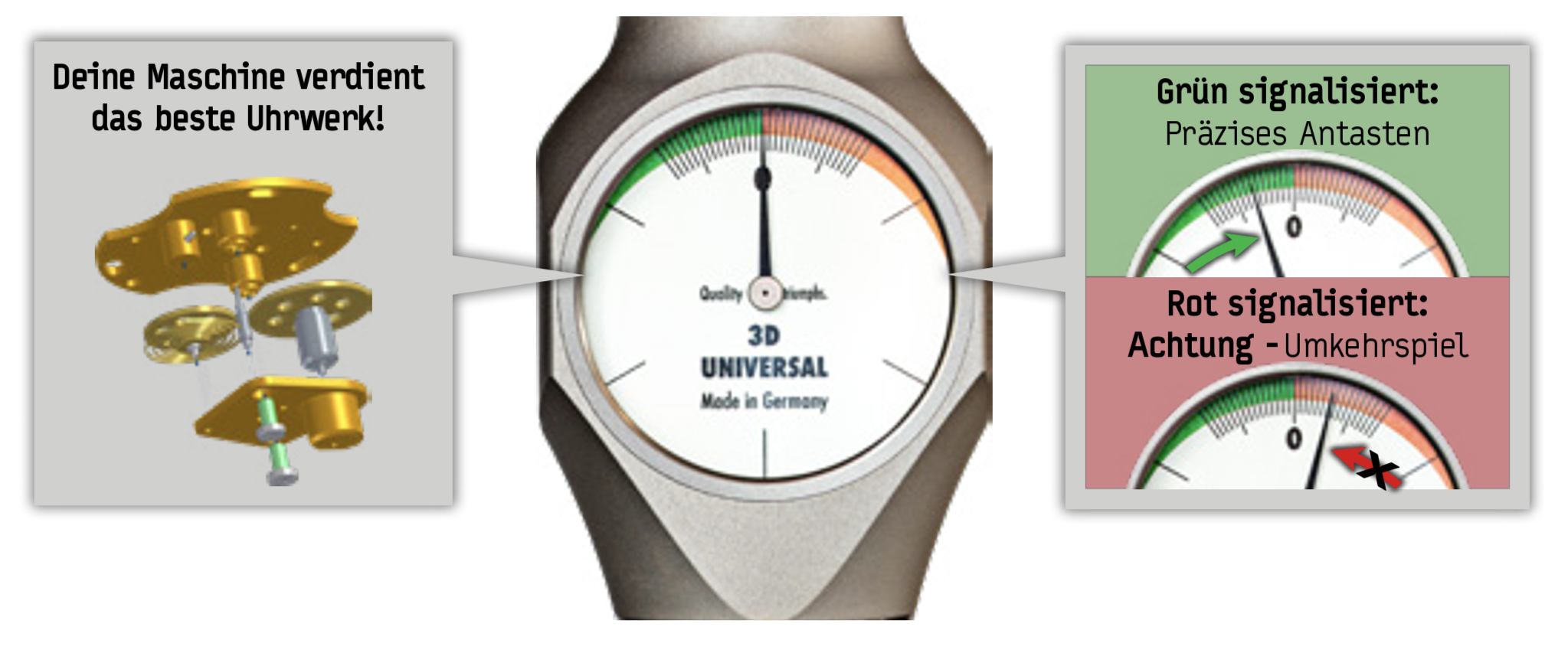 Tschorn 3D-Tester UNIVERSAL - Ny helt superslimmad analog version för inmätning i alla axlar (X-, Y-, Z-axel). När mätklockan visar noll är spindelaxeln exakt på arbetsstyckets kant.