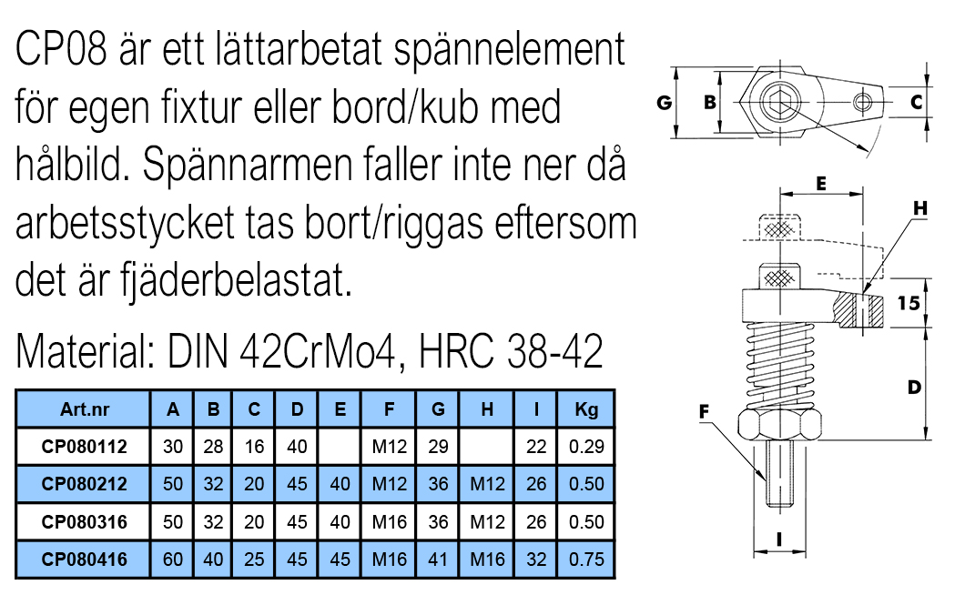 CP08 är ett lättarbetat spännelement för egen fixtur eller bord/kub med hålbild. Spännarmen faller inte ner då arbetsstycket tas bort/riggas eftersom det är fjäderbelastat.