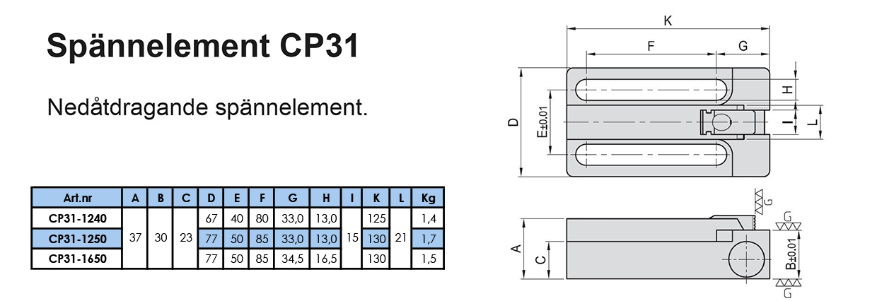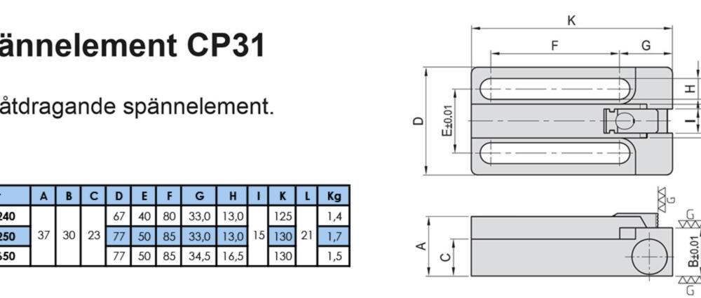 CP 31 (lågt utförande) är ett spännelement för montage på referensbord, T-spårsbord eller för inbyggnad i fixturer. CP 31 har många fördelar:
